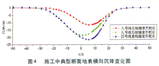 1)仅九号线的施工,地表最大沉降基本与施筑二衬的情况相同,地表最大沉降为19.3mm,但是施工四号线后,由于九号线继续的收敛变形引起地层损失增大,故地表沉降增大了,四号线施工完之后的地表最大沉降约为26.5mm,增加量为37%;