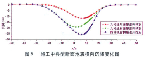 施工中,典型断面(y=6m)的地表横向沉降曲线见图5所示,由于九号线没有施筑二衬,结构刚度降低,在上部荷载作用下,会继续产生向内的收敛变形,故地表沉降增大。