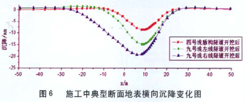 (1)上方盾构隧道施工之后,预测地表最大沉降约为10mm,下方九号线左线施工之后,地表最大沉降为15.0mm,下方九号线右线施工之后,地表最大沉降为19.2mm。这里需要说明的是:根据北京地铁盾构隧道的施工经验,盾构施工实际沉降量大约在5mm~7mm,而本次计算结果偏大的原因主要在于计算中无法考虑土压平衡工况。施工中,典型断面(y=6m)的地表横向沉降曲线见图 6所示。