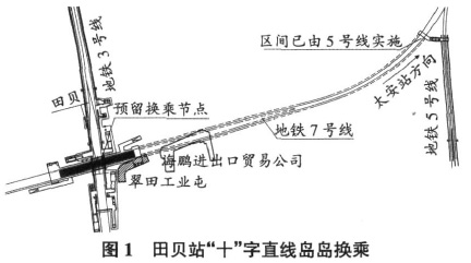 7号线田贝站为与3号线换乘站,先期实施的3号线已经在此预留了“十”字换乘节点,站台宽度为12 m。存在如下控制因素: