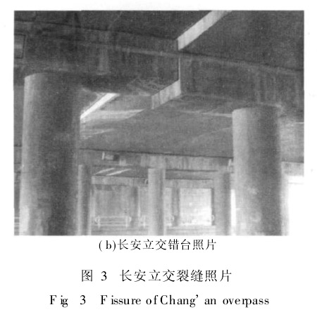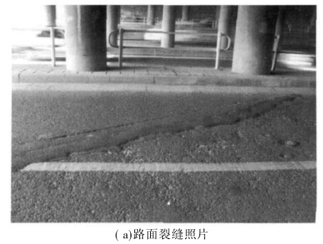 长安立交下发育f6地裂缝,该地裂缝出露于长安立交下,裂缝延伸距离较长,平面展布弯曲。该段总体走向近东西,东侧穿过长安立交后沿NE55~65°方向延伸,进入草场坡村。地裂缝造成地面开裂显著,宽10~20 cm,主裂缝南盘与次裂缝北盘均产生明显下错。立交桥附近路缘及桥下柱基均产生了明显的错动变形,导致上部梁体错台达21 cm,见图3。
