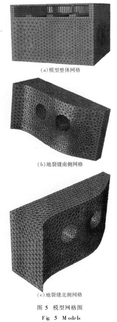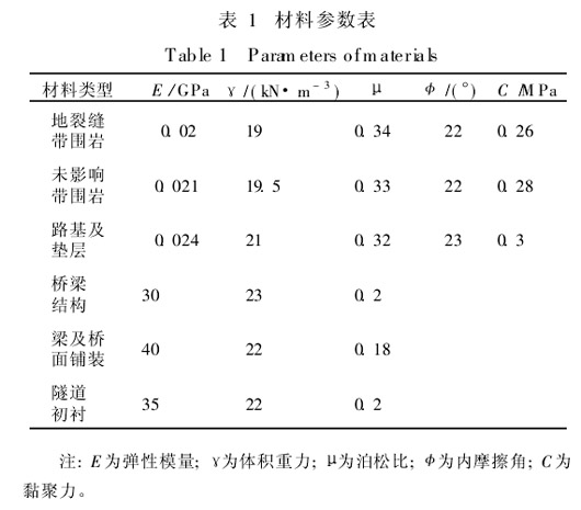 对地裂缝的模拟采用的是降低参数的方法,由地裂缝向南北两侧各延伸5m的范围内采用比一般围岩较低的参数,根据地勘资料,模拟范围内围岩级别为(九)级或v级。各部分具体材料参数见表1。
