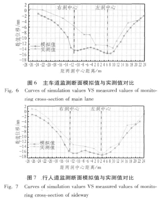 将数值模拟结果和实测数据进行对比,一方面可以验证数值模拟的正确性,另一方面通过正确的数值模拟结果可以更进一步分析在隧道开挖过程中围岩的变化情况和施工对上部立交桥的影响。