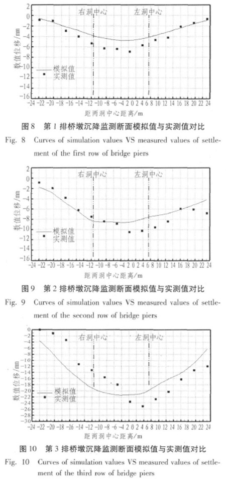 从图8—10看出:第1排桥墩监测断面的实测值和模拟值都是沿两洞中心对称分布,左右洞基本是同时通过第1排桥墩监测断面的,因此其沉降也呈对称分布;第2排桥墩和第3排桥墩监测断面的沉降曲线则是左洞侧沉降大于右洞测沉降,第2排桥墩和第3排桥墩位于地裂缝附近,第2排桥墩距地裂缝约5m,而第3排桥墩则横跨地裂缝,地裂缝两侧的破碎地质在隧道开挖时产生更大的沉降。