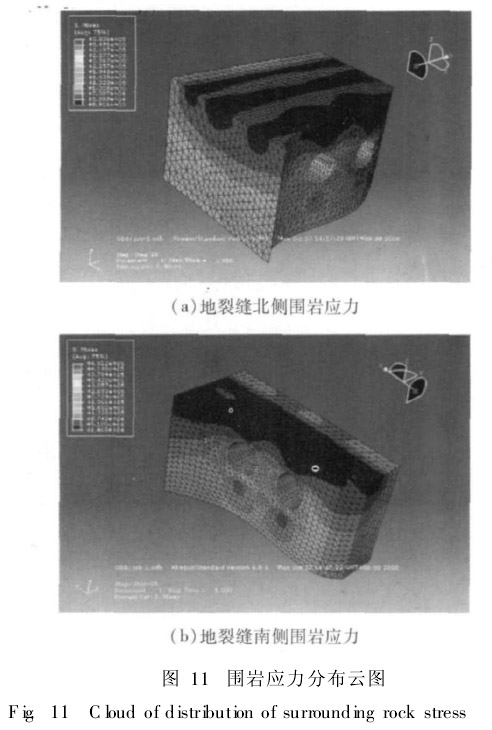图11为围岩应力分布云图。从模拟结果看出:在围岩应力方面,开挖时隧道上下台阶结合处的围岩应力较集中,随着隧道支护的施作和距离掌子面越远,应力集中趋于和缓;随着掌子面的推进,在掌子面仰拱下方约6m的范围内围岩应力增大较快,并随着掌子面的推进而移动;因此,在施工中,为确保初期支护连接处的质量,应及时施作临时仰拱及将衬砌施作成环。地裂缝南北两侧围岩应力分布无明显差别。