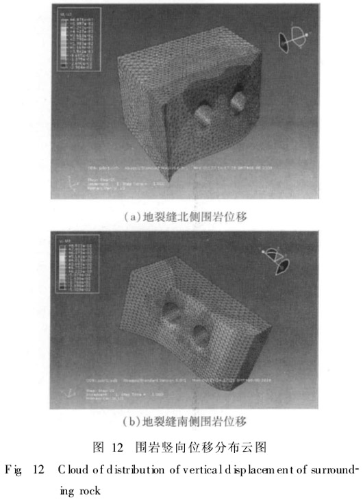 图12为围岩竖向位移云图。从图中可以看出:由于隧道的开挖,在掌子面上方形成了一个沉降区,在离地裂缝地址破碎区较远处的围岩,该沉降区各自独立,并且没有达到地表;在掌子面进入地裂缝破碎带后,左右洞拱顶沉降区逐渐扩大达到地表并在两洞中心处交会形成一个较大的沉降范围,最大沉降发生在拱顶部位,最大值为35mm。