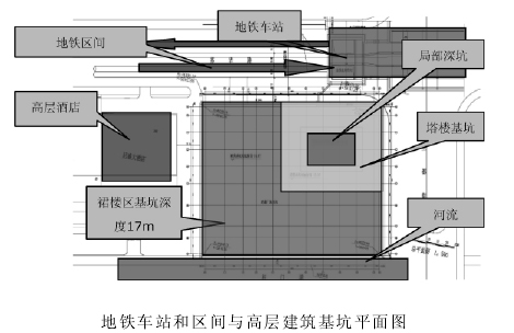 1号线之间的平面关系高层建筑基坑与地铁站围护地墙距离约12.55m,与盾构区间的距离约为13.5m,如下图所示:
