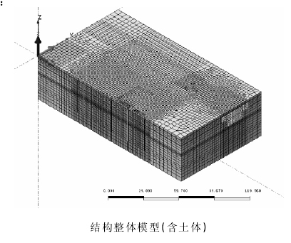 由于 基 坑 主 要 为 深 度17m,基 坑 平 面 尺 寸 为94.5m×79.55m,根据高层基坑与地铁设施的平面关系,可以仅选取一半的基坑即北侧的基坑进行分析,同时基坑东西两侧至少各选取两倍基坑深度范围,北侧选取地铁端头井地墙外侧约20m的范围,因此选取的平面尺寸约为171m×97m,基坑深度为17m,计算深度选取大于2.5倍基坑深度约45m,结构模型如下图: