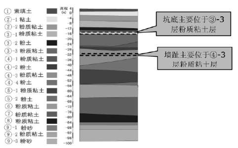 拟建工程为集办公和商业为一体的超高层建筑,主楼高度186m,裙楼高度28.2m,拟采用桩 筏 基 础,基 坑 开 挖 深 度 在17.0~19.5m左 右,局 部 深 坑 为23.75m,开 挖 平 面 尺 寸79.55m×94.5m,基坑变形控制保护等级为一级,地面最大沉降量≤0.1%H,围护墙最大水平位移≤0.14%H(H为基坑开挖深度),且≤30mm。其中,北侧地下墙位移控制按照地铁保护要求,不大于20mm。