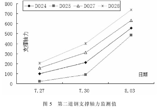 从图4和图5可以看出,第二道支撑架设之后,第一道支撑轴力逐渐减小,第二道支撑轴力逐渐增加,土压力不对称侧支撑轴力D027和D028明显大于土压力对称侧D024和D025轴力。第二道混凝土支撑最大值为D028为737.9kN,小于设计值的26%。混凝土支撑D024最大值为556.2kN,小于设计值的44%,混凝土角撑D026为417.9kN,小于设计值的58.2%。D026轴力是D024轴力的75.13%,为了工期需要,设计中要求当基坑开挖到第二道支撑位置时,才施做第一道钢支撑和第二道混凝土支撑。第二道混凝土角撑D026小于D024支撑的24.9%,小于D02支撑的43.5%,说明深基坑支护结构空间效应明显。
