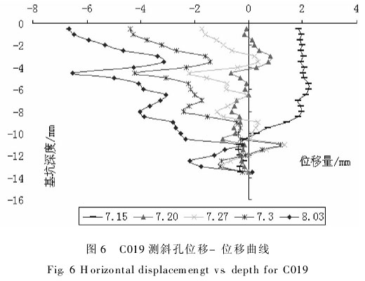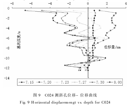 如上图图9所示,测点C024随着深基坑逐步开挖,第一道支撑架设前,支护结构一直向基坑内变形,在第一道支撑架设之后,由于已建主体结构巨大的支撑作用,且基坑两边土压力的不平衡,造成基坑位移向基坑外移动,基坑变形的最大值在支护结构的顶面。最大值为-6.5mm。随着基坑土体开挖,支护结构最大变形位置没有变化,证明支撑刚度能够有效控制分部开挖对支护结构变形的影响。