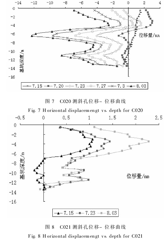 C021监测点变形如图8所示,随着深基坑的逐步开挖,支护结构一直向基坑内侧变形,最大变形在第一道钢支撑下面,位移为2.3mm,钢支撑与支护结构夹角为37°,说明支撑于支护结构夹角较小时,钢支撑限制变形的能力不明显。