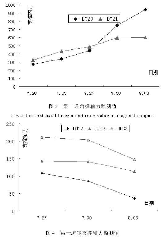 根据图3所示,混凝土角撑的内力随着深基坑的分部开挖而逐渐增大,D020初始值为273kN,第一道钢支撑施加预应力之后,混凝土支撑轴力仍然增加,第二道混凝土支撑架浇注之后,继续进行开挖,已建地铁车站主体结构顶板、中板、底板对出入口支护结构具有巨大支撑作用,随着深基坑的开挖,第一道角撑轴力继续增加,角撑D020超过设计值500kN的89%,达到942.20kN,角撑D021超过设计值500kN的20%,达到600kN,可见,由于第一道混凝土角撑开挖之前架设,混凝土角撑与冠梁协调合作,有利于协调基坑整体受力和变形,设计中需要加大角撑支撑刚度。