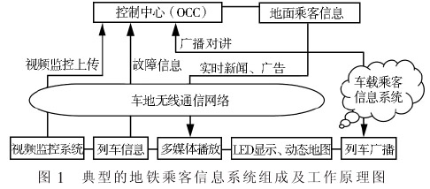 地铁列车乘客信息系统主要由列车广播、 车载视频监控、多媒体播放、车站动态地图、LED 显示等子系统组成。 图 1 为一个典型的地铁乘客信息系统组成及工作原理图。 列车乘客信息除了满足基本的多媒体播放、广播、视频监控功能外,能独立满足自身系统的车内视频监控、多媒体播放、司机乘客广播、对讲等功能,另外还需要和另一大系统———地面乘客信息系统设备相互连接,才能实现信息互动,地面乘客信息系统可通过车地通信网络传输并播放乘客须知、媒体新闻、广告等实时动态信息。带宽富裕情况下,地面乘客信息系统还能与列车乘客信息系统相结合,将车辆内部图像、车辆故障信息等实时上传到控制中心, 充分保障列车的行车安全。