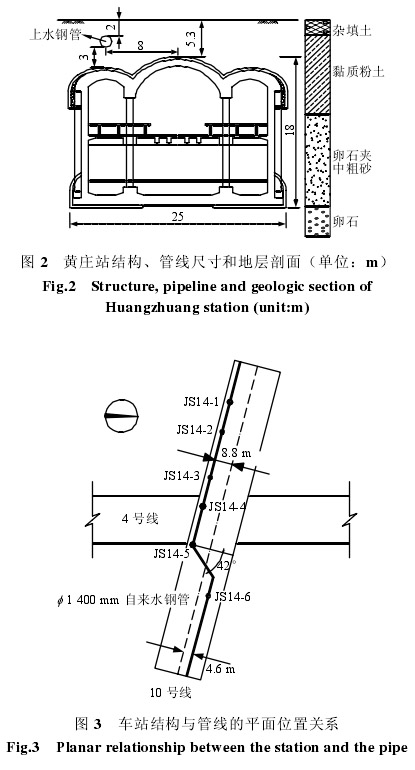 地铁车站施工对刚性接头管线的影响研究较少(刚性接头管线是指在保证使用功能的条件下,接头不能或不允许发生转动的管线,典型的刚性接头管比如焊接钢管),本文以北京地铁 10 号线黄庄站工程为背景,在对管-土相互作用合理模拟的基础上,运用数值分析与现场监测数据结合的方法,选取直径为 1 400 mm 的上水钢管作为研究对象,系统研究了洞桩法车站施工对地层和刚性接头管线的影响。