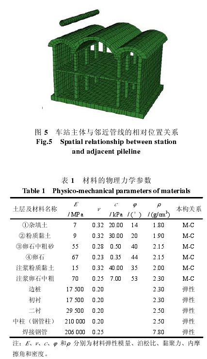 摘 要:洞桩法能够较好地控制地层变形和对周边既有建(构)筑物的影响,目前已成为北京地铁暗挖车站施工的主流工法。以北京地铁 10 号线黄庄站工程为背景,基于地表和管线沉降的实测数据,建立“隧道-管道-土体”的三维有限元计算模型,研究了洞桩法车站施工对地层的影响,并从沉降、变形和管-土相互作用等方面系统研究了施工对邻近刚性接头管道的影响。研究结果表明,洞桩法车站施工中导洞和扣拱施工是关键工序,这两个工序引起的地表沉降占总沉降的 90%以上;刚性接头管道的沉降、变形及管道-土体差异沉降与管道和隧道相对位置关系密切相关,主要受其正下方土体开挖影响;管道变形由整个管体共同承担,地层位移使管道产生弯曲和轴向变形,建议采用应变作为管道变形控制标准。