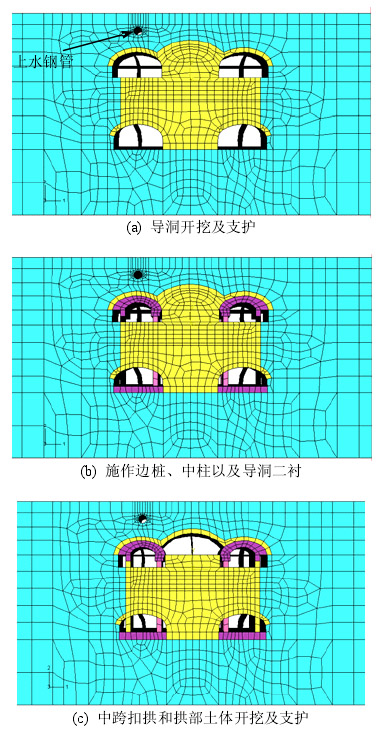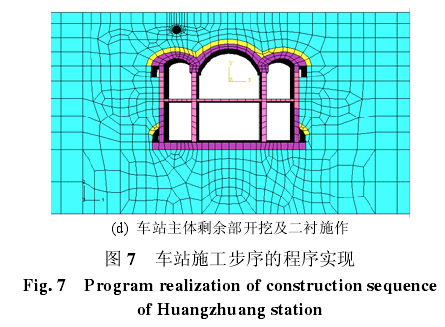 车站采用四导洞的洞桩法施工,导洞开挖步序如图 6 所示,为更好地控制地层变形,上导洞采用交叉中隔壁法(CRD 法)施工。典型施工步序包括:①导洞开挖及支护(见图 7(a));②边桩、冠梁及中间立柱施工,施作导洞二衬(见图 7(b));③ 扣拱施工,中跨拱部土体开挖及支护,拱部二衬施工(见图 7(c));④开挖至结构中楼板底标高处,施做中板和上层边墙;⑤开挖至底板底,施作底板及下层边墙(见图 7(d))。导洞和中跨拱部土体每次开挖进尺为 1 m,共分 20 步开挖,相邻开挖步间距为 5 m。