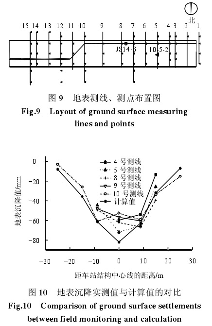 地表沉降监测数据分析:10 号线黄庄站地表沉降测点布置如图 9 所示,共有 15 条测线,位于管线测点范围内的测线共有 5 条,分别为 4、5、8、9、10 号测线。这 5 条地表沉降测线的最终沉降槽曲线与计算曲线如图 10 所示,从图中可以看出,实测最大地表沉降发生在 5 号测线的 10-5-2 号测点,达到72 mm。管线 JS14-3 号测点位于 8 号测线,最终沉降最大值为62 mm,计算值大于实测值约30%左右。数值计算中选择管道顶部正上方的地表沉降为主要标定值,使得数值计算结果在该处与实际尽量符合,导致了车站轴线正上方的地表沉降计算结果偏大。
