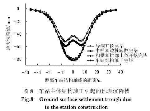 取模型纵向 10 m 处的横断面为地表沉降的监测断面,各施工阶段的地表沉降槽如图 8 所示。洞桩法施工引起的最大地表沉降在 82 mm 左右。分析表明,洞桩法施工中,导洞开挖支护所引起的地表沉降约占最终沉降的 53%左右;施作边桩、中柱以及导洞二衬所引起的地表沉降约占最终沉降的8.8%左右;中跨扣拱和拱部土体开挖及支护所引起的地表沉降约占最终沉降的 35%左右;剩余的土体开挖,二衬施工所引起的地表沉降约占最终沉降的3%左右。拱部土体开挖和支护完毕后,地表沉降趋于稳定,后续施工在导洞及拱部初支、边桩和中柱的保护下进行,所引起的地表沉降很小。因此,可按前 3 个典型阶段进行沉降控制和分析,前 3 个典型施工阶段引起的地表沉降比例大约为5.5:1.5:4.2。