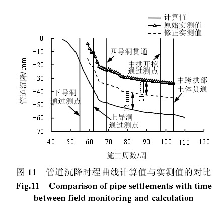 由于管道初测时,管顶正上方的地表测点已发生部分沉降,其中 JS14-3 测点上方地表沉降为10.2 mm。考虑到地中沉降大于地表沉降,管线未测到的沉降应略大于 10.2 mm,假定未测到的沉降为 11 mm 时,管道沉降实测时程曲线与计算曲线的对比如图 11 所示,虚线为考虑管道未测到的沉降为11 mm 修正后的曲线。实测曲线与计算曲线趋势基本一致,计算值略大于实测值。