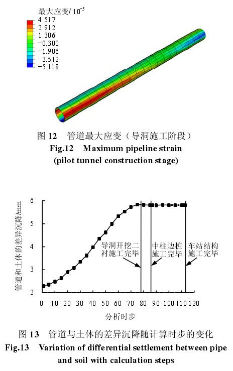 (3)管道最大应变发生在导洞施工阶段,受管道正下方土体开挖影响最大,最大拉应变 45 με 和压应变 52 με 均小于控制标准。