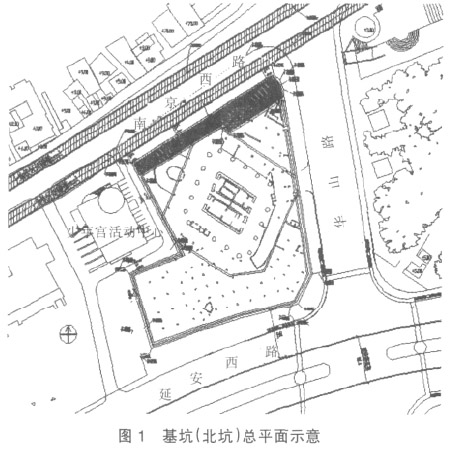 广场基坑东西长约 95 m、南北宽约 100 m. ,开挖深度 19. 8 ~ 25 m。基坑北侧邻南京西路,路面宽度为 18 m,路面下由近及远埋有地下电缆 15 根、φ1350 mm 雨水管和 23 孔通信管等地下管线; 南京西路道路北侧有 1 幢高层建筑( 百乐门大酒店) 和3幢多层建筑,基坑围护边线距百乐门大酒店约 40m,距 3 幢多层建筑约 34 m; 基坑北侧平行于邻近地铁 2 号线区间隧道( 隧道埋深约8 m) ,平行长度范围为 90 m。北坑总平面示意见图 1,基坑与地铁隧道的相对关系剖面见图 2。
