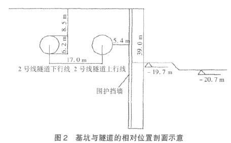 北区基坑周边环境复杂,平行距地铁 2 号线隧道最近 5 m,与隧道平行长度为 90 m,基坑比隧道埋深还深约 8 m,深基坑工程施工将对周边隧道产生重大影响。