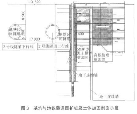 为保护地铁隧道正常运行,基坑围护设置了深约 40 m、墙厚 1 m 的地下连续墙,地铁侧地下连续墙两侧设深 32. 5 m 的 SMW 工法预加固桩; 北区基坑土体采用水泥土搅拌桩和高压旋喷桩加固: 近地铁侧宽 10 m 内、基底以下 4 m 至基底以上 10 m 范围土层均由高压旋喷桩加固,其余侧坑底以下 4 m土层采用水泥土搅拌桩,加固宽度 6 m。基坑与地铁隧道围护桩及土体加固剖面见图 3。