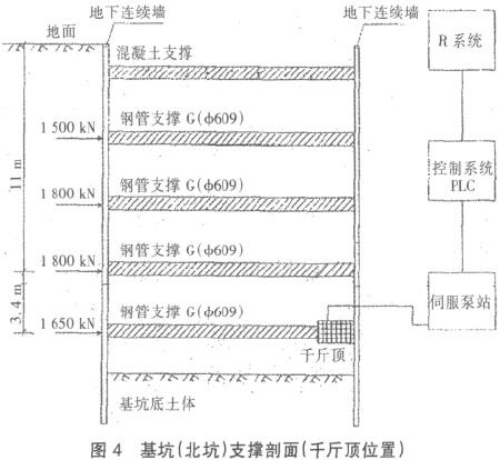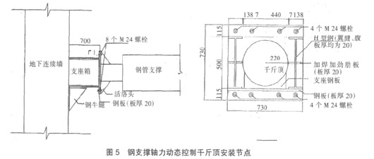 基坑内每组钢支撑都有 1 个压力传感器,通过压力传感器的测定可实时反映支撑轴力,必要时调整千斤顶的压力。