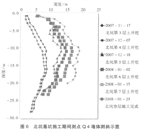 北区基坑开挖时,监测显示基坑地下连续墙测斜达到控制目标值,北侧地下连续墙测斜最大值点为 Q 4(见图 6)。