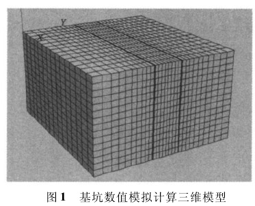 考虑到基坑平面、支护结构、地面附加荷载以及基坑开挖情况对基坑西部标准段部分建立模型,进行有限差分计算。基坑开挖深度为 16 m,当前开挖长 64m,基坑宽 18. 5 m。根据基坑开挖影响长度方向约为开挖深度的 3 ~ 4 倍,深度方向约为开挖深度的 2 ~ 4倍,取基坑沿长边方向延伸约 46 m,基坑两侧短边各延伸约 40 m,基坑底部以下取 44 m,即基坑模型尺寸为 110 m×100 m×60 m( 长×宽×高) ,如图 1 所示。土体单元及地下连续墙均采用块体单元,模型单元总数7 460 个,节点总数为 9 348 个。模拟计算中,边界条件为模型底部位移全约束。因北面( 模型右侧) 为鲁巷广场购物中心大楼,计算过程中在模型右侧施加大楼自重荷载。