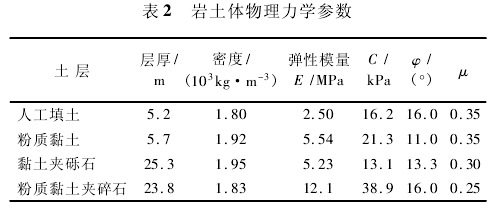 根据岩土工程勘察报告及前期参数反演研究结果,计算过程中,采用的岩土体物理力学参数如表 2 所示。