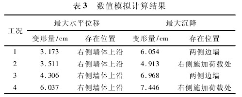 由于基坑左右两侧受力情况不同( 右侧施加大楼自重荷载) ,基坑开挖初期,右侧墙体水平位移明显大于左侧墙体,随着基坑开挖深度的增加,右侧墙体水平位移逐步增加,而左侧水平位移反而逐渐减小,从基坑两侧受力不均来分析,应是右侧墙体变形在外力作用下发展加快。基坑地表沉降一方面由于土体自重引起沉降,另一方面由于外荷载的存在和地下水的影响,部分地区沉降加大,尤其是外荷载存在处,沉降变形最大。随着开挖步序的进行,沉降变形先由于开挖回弹的影响在一定程度上有所减小,然后随着开挖深度的加大,变形迅速增大,开挖深度至设计深度时达到最大值 7. 446 cm,沉降最大出现在基坑右侧施加荷载处,基坑底部隆起加剧,最大值达到 30 cm。