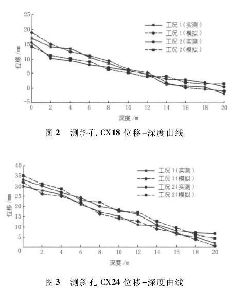 现场采用 CX-3C 型基坑测斜仪对施工过程中基坑变形进行监测并记录。其中,在基坑两侧墙体位置布置 CX18( 左侧墙体附近) 和 CX24( 右侧墙体附近)测斜孔进行现场位移监测。在数值模拟过程中,在相同位置,设置测斜孔进行监测。根据现场工况 1、工况2 结束后的监测结果,与数值模拟结果进行对比分析,如图 2,3 所示。