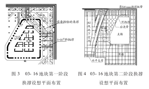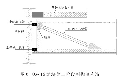 03- 16 地块第二阶段换撑设计工况为:我们在附楼及地下空间北侧每隔 4 m左右间距设置 φ609 mm钢管斜抛撑,并将斜抛撑上牛腿设置于结构外板墙上,下牛腿设置于基础底板上,待板墙外侧与围护桩之间完成回填后,要在相应顶板标高处设置厚为 500 mm的素混凝土换撑板带,同时在 B2线地下 2 层侧墙位置 - 14.45 m标高(即地块底板标高)处,按 8 m左右间距设置 φ609 mm钢管水平支撑,以满足东西向围护体系传力的需要(图 4)。
