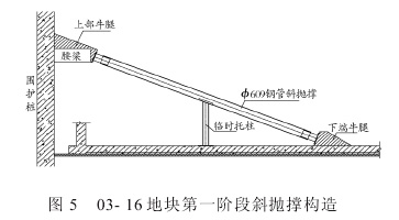 03- 16 地块第一阶段换撑设计工况为:我们在东侧及北侧各安装 5 根 φ609 mm钢管斜抛撑,从而提前拆除影响主楼地下 2 层结构施工的角撑;将斜抛撑上牛腿设置于支撑腰梁上,下牛腿设置于基础底板上(图 3)。