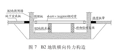 在 B2 线地下空间地下 2 层侧墙施工的同时,要在侧墙- 14.45 m标高位置,预埋 φ609 mm钢管水平支撑埋件。当侧墙与附楼底板之间的换撑板带施工完成后,应安装 B2 线内东西向 φ609 mm钢管水平支撑,在并利用千斤顶施加500 kN预应力。为保证水平支撑的稳定,还要在钢管下砌筑临时砖砌支墩(图 7)。