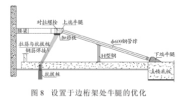 由于 4#~5#斜抛撑底部牛腿离腰梁距离较远,为避免φ609 mm钢管过长,所以我们将 4#~5#斜抛撑顶部牛腿设置于边桁架外侧支撑梁上。因 φ609 mm钢支撑施加完预应力并受到围护桩传递过来的土压力后易发生破坏,为此需对该处支撑梁进行加固。这里通过设置 20 根 φ20 mm拉筋的方法,即可分解其所受到的荷载。具体方法为:拉筋下端与工程抗拔桩预留钢筋焊接,上端与通过对拉螺栓固定于支撑梁上的加劲板焊接(图 8)。