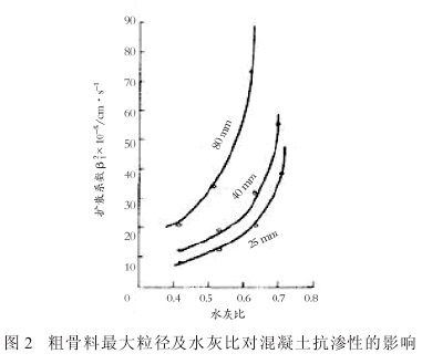 在水灰比固定的情况下,石子最大粒径越大,混凝土的抗渗性越差。图 2 为粗骨料最大粒径分别为 80 mm、40 mm及 25 mm的混凝土扩散系数对混凝土抗渗性的影响(图 2)。