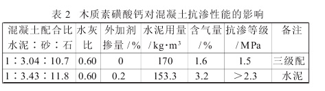 混凝土的抗渗能力会随着含气量的增加而提高。表2为掺引气剂混凝土的抗渗性对比,表3 为掺木质素磺酸钙混凝土的抗渗性对比。