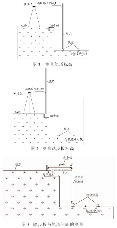 此安装方法是先在站台上架设 1 台水准仪,并将5 m塔尺搁在轨道上,从水准仪中读取塔尺刻度(图3),然后将 5 m塔尺移到踏步板位置,读取塔尺刻度(图 4),再将刻度 1 减去刻度 2,得到踏步板与轨道相对标高尺寸。如果没有达到安装规定的尺寸1 050 mm,则需依次调节踏步板高度,再重新测量踏步板的标高,直到水准仪读出的数据满足安装要求。