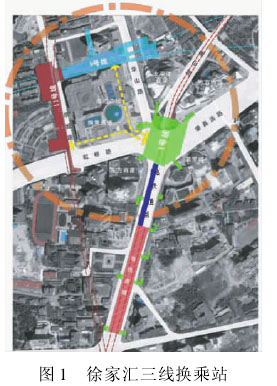 徐家汇位于上海中心城区的西南部,紧邻上海交通大学,是上海市十大著名的商业中心之一。徐家汇商圈是集购物、娱乐、办公、商贸、休闲、住宿、餐饮、培训教育为一体的综合性商业区域,同时也是上海市重要的 交 通 枢 纽 之一,有 1、9、11 号共3 条城市轨道交通在此交会,形成三线换乘的徐家汇地铁站( 见图 1)