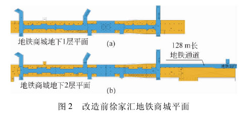根据改造的设计要求,将原徐家汇地铁商城的地下 2 层改造为 10 m 宽的人行社会通道、地下 1 层作为地铁公司内部管理用房使用,并预留重新作为商业使用的空间; 将连接车站站厅与人行社会通道的 128 m长地铁通道改造为文化艺术长廊。