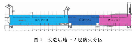 本层虽主要功能为地铁人行通道,但考虑到通道两侧预留的服务用房有可能作为商业利用,因此按商业的功能要求来划分防火分区,共划分 3 个防火分区:D 区建筑面积为 1 993 m2,E 区建筑面积为831 m2,F 区建筑面积为 1 297 m2( 见图 4) 。