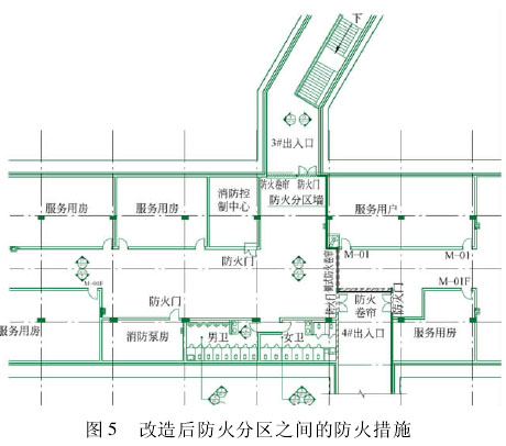 相邻防火分区之间的走道设防火卷帘分隔,考虑到结构净高太低及吊顶上部管线通行的需要,本次设计在公共走道部位选用了侧向开启的防火卷帘门( 加密水喷淋保护) ; 设备用房均采用防火墙,并开设甲级防火门; 每个防火分区确保有 2 个直通地面的出入口,且与出入口通道之间设防火卷帘门和甲级防火门,使得平时使用与火灾时疏散分开、互不干扰( 见图 5) 。