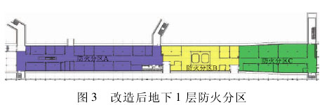 根据既有出入口的分布以及每个防火分区的建筑面积控制要求,本层共划分 3 个防火分区: A 区建筑面积为1951 m2; B 区建筑面积为1221 m2( 地下1 层中庭挑空部分为157 m2,其四周用防火卷帘分隔纳入到地下 2层的防火分区内) ; C 区建筑面积为1 317 m2。见图3。