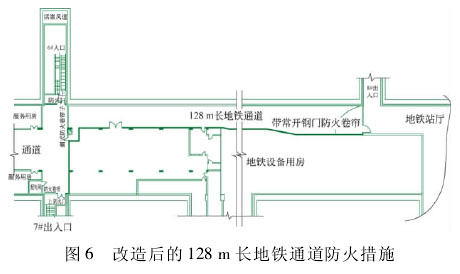 结合上海地铁 1 号线徐家汇地铁站内商业城及地铁通道的改造项目设计,在不破坏原结构的前提下,采取了合理的防火分隔、加设防火门及多种形式的防火卷帘门等有效的消防措施,较好地解决了既有地下建筑的消防问题。由于是对既有地下建筑的改造,限于既有条件,像 128 m 地铁通道的长度超过规范限值就无法满足现行的《地铁设计规范》[5]要求,但其他方面满足了现行建筑防火设计规范的相关规定。
