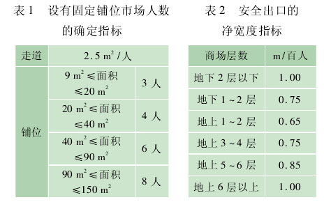 由于本项目地下1、2 层预留重新作为商业使用的空间,因此应按商业的要求来计算需要疏散的人数及疏散门的宽度。根据上海市消防部门的要求,地下商场营业厅的疏散人数应根据营业厅的建筑面积按 3 m2/ 人确定[3]。设有固定分隔铺位的市场,其人员总数可按走道人数和各铺位人数之和计算,并应按表 1 的规定计算。营业厅的安全出口总宽度,包括楼梯间的门、底层疏散外门和楼梯宽度,均应根据疏散人数和商场的层数,按不小于表2 规定的净宽度指标计算。