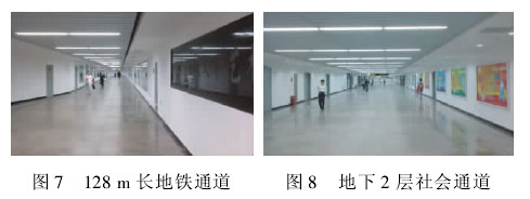地下2 层长 226 m,宽 18. 7 m,建筑面积为 4 121 m2。改造后,本层中部设为10 m 宽的纵向人行社会通道,与原商业与地铁公共区之间的128 m 长地铁通道相贯通,并与6 个通往地面的出入口一起构成了地铁进出站的人行通道。在社会通道两侧的富余空间设置了 30 个服务房间,可供地铁管理人员使用或作为商业利用,另设置有公共厕所、污水泵房、配电间等配套用房。