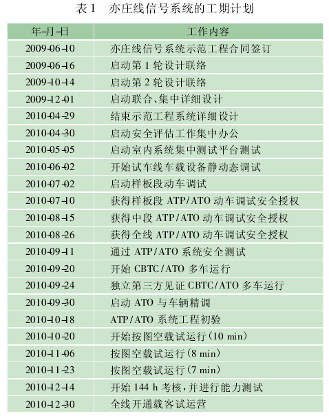 北京轨道交通亦庄线信号系统示范工程自合同签订到开通运营,前后历时18 个月,其中主要节点见表1。
